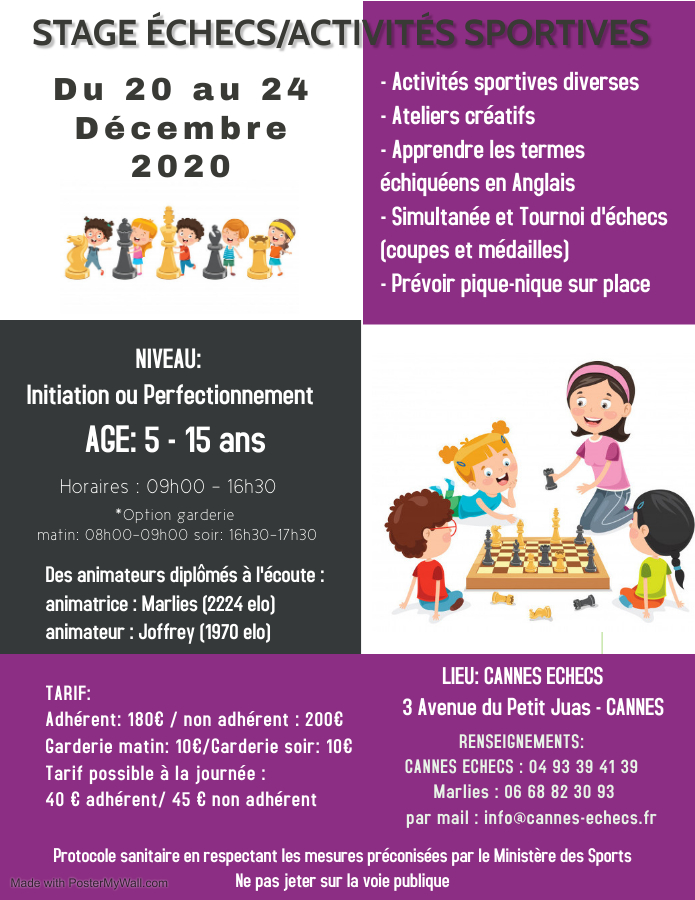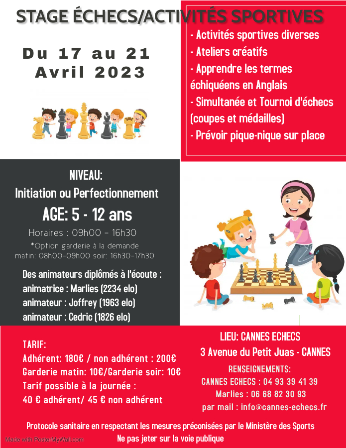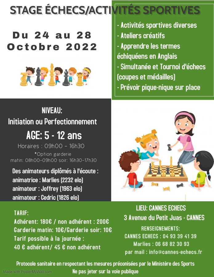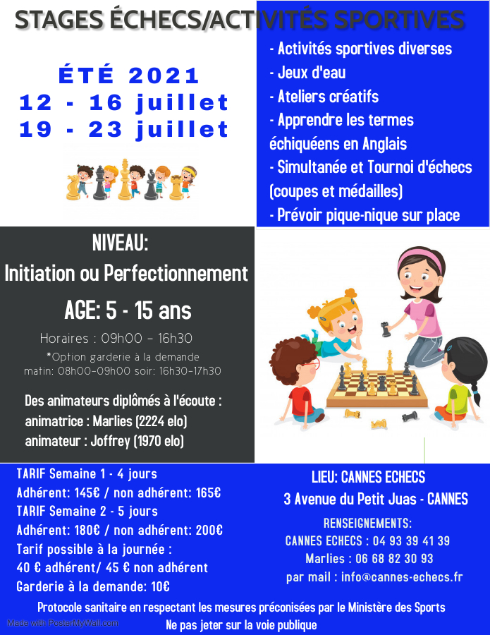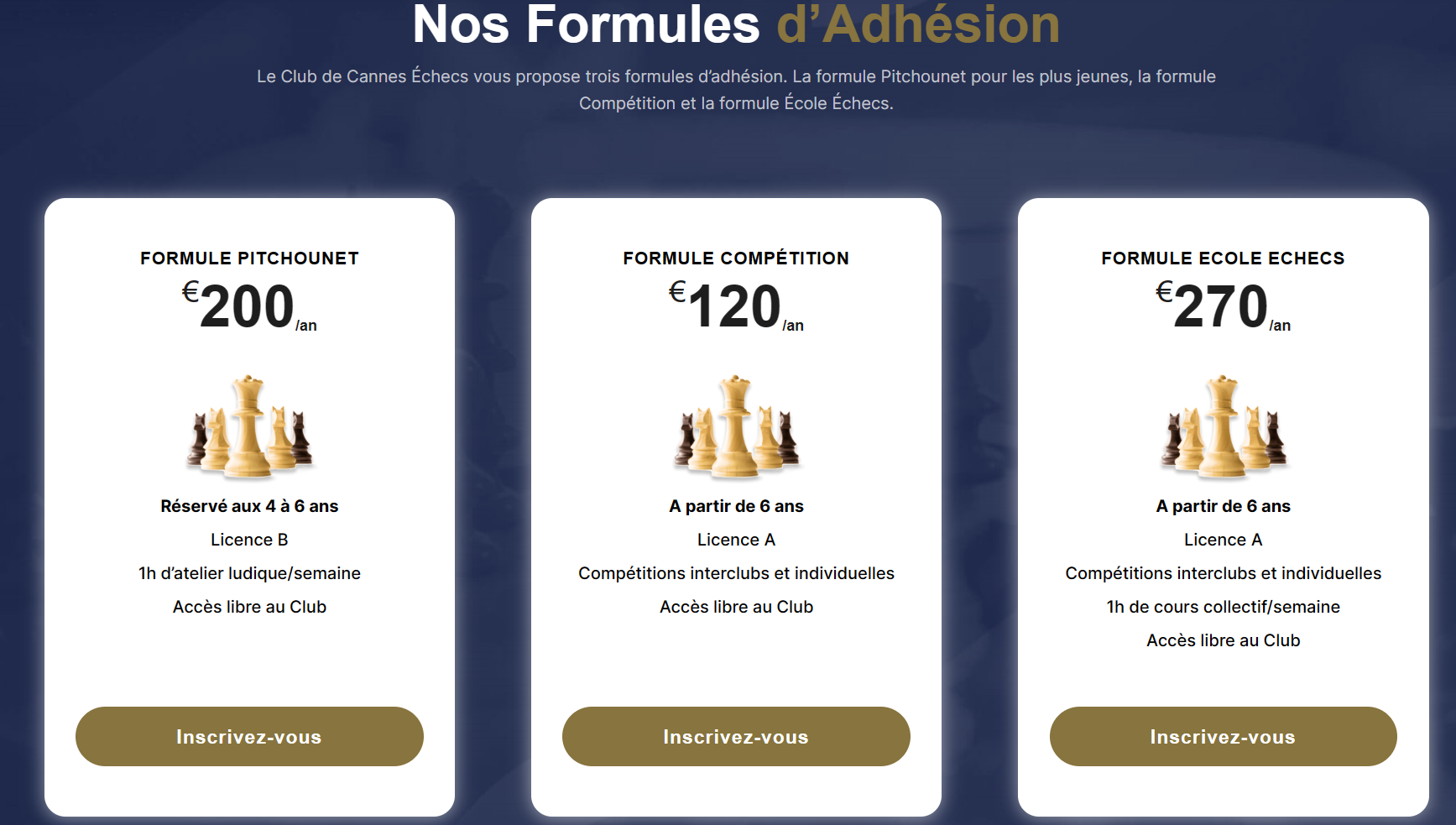 Le club, situé en centre ville, rénové et inauguré en 2006, est ouvert tous* les après midis de 13 h 30 à 19 h 30 ; les samedis et dimanches sont réservés aux compétitions. (*sauf fériés et fermetures annuelles). Cannes Echecs a obtenu le label F.F.E. de club formateur, de meilleur organisateur, et de meilleur club jeune de France (5 fois Oscar ) et conquit le titre de champion de France jeunes par équipes pour la sixième année consécutive. Diverses formules modulables pour progresser, découvrir et jouer : Le club, situé en centre ville, rénové et inauguré en 2006, est ouvert tous* les après midis de 13 h 30 à 19 h 30 ; les samedis et dimanches sont réservés aux compétitions. (*sauf fériés et fermetures annuelles). Cannes Echecs a obtenu le label F.F.E. de club formateur, de meilleur organisateur, et de meilleur club jeune de France (5 fois Oscar ) et conquit le titre de champion de France jeunes par équipes pour la sixième année consécutive. Diverses formules modulables pour progresser, découvrir et jouer : Le club, situé en centre ville, rénové et inauguré en 2006, est ouvert tous* les après midis de 13 h 30 à 19 h 30 ; les samedis et dimanches sont réservés aux compétitions. (*sauf fériés et fermetures annuelles). Cannes Echecs a obtenu le label F.F.E. de club formateur, de meilleur organisateur, et de meilleur club jeune de France (5 fois Oscar ) et conquit le titre de champion de France jeunes par équipes pour la sixième année consécutive. Diverses formules modulables pour progresser, découvrir et jouer : Les cours ont lieu les mercredis et samedis, les tournois et compétitions se déroulent les weekends. Cannes Echecs est le plus important club formateur de France avec 9 titres de champion de France jeunes par équipes (record national) et plusieurs dizaines de titres individuels. L'association intervient depuis plus de 30 ans en milieu scolaire à Cannes et dans ses environs. |