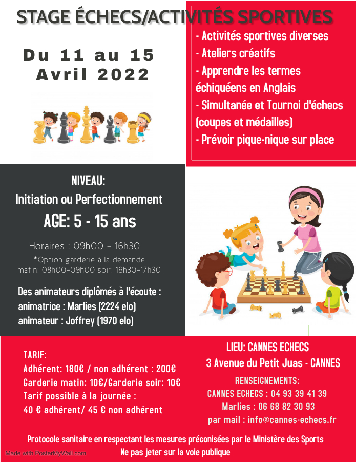 Le club, situé en centre ville, rénové et inauguré en 2006, est ouvert tous* les après midis de 13 h 30 à 19 h 30 ; les samedis et dimanches sont réservés aux compétitions. (*sauf fériés et fermetures annuelles). Cannes Echecs a obtenu le label F.F.E. de club formateur, de meilleur organisateur, et de meilleur club jeune de France (5 fois Oscar ) et conquit le titre de champion de France jeunes par équipes pour la sixième année consécutive. Diverses formules modulables pour progresser, découvrir et jouer : Le club, situé en centre ville, rénové et inauguré en 2006, est ouvert tous* les après midis de 13 h 30 à 19 h 30 ; les samedis et dimanches sont réservés aux compétitions. (*sauf fériés et fermetures annuelles). Cannes Echecs a obtenu le label F.F.E. de club formateur, de meilleur organisateur, et de meilleur club jeune de France (5 fois Oscar ) et conquit le titre de champion de France jeunes par équipes pour la sixième année consécutive. Diverses formules modulables pour progresser, découvrir et jouer : Le club, situé en centre ville, rénové et inauguré en 2006, est ouvert tous* les après midis de 13 h 30 à 19 h 30 ; les samedis et dimanches sont réservés aux compétitions. (*sauf fériés et fermetures annuelles). Cannes Echecs a obtenu le label F.F.E. de club formateur, de meilleur organisateur, et de meilleur club jeune de France (5 fois Oscar ) et conquit le titre de champion de France jeunes par équipes pour la sixième année consécutive. Diverses formules modulables pour progresser, découvrir et jouer : Les cours ont lieu les mercredis et samedis, les tournois et compétitions se déroulent les weekends. Cannes Echecs est le plus important club formateur de France avec 9 titres de champion de France jeunes par équipes (record national) et plusieurs dizaines de titres individuels. L'association intervient depuis plus de 30 ans en milieu scolaire à Cannes et dans ses environs. |