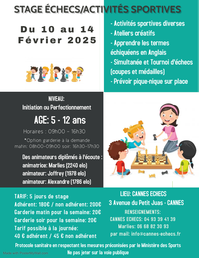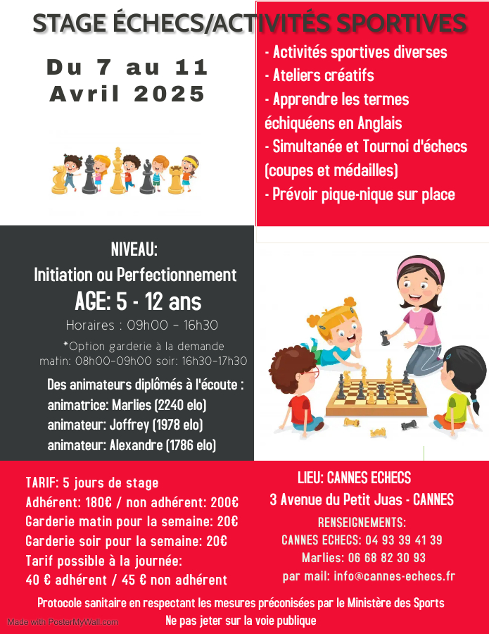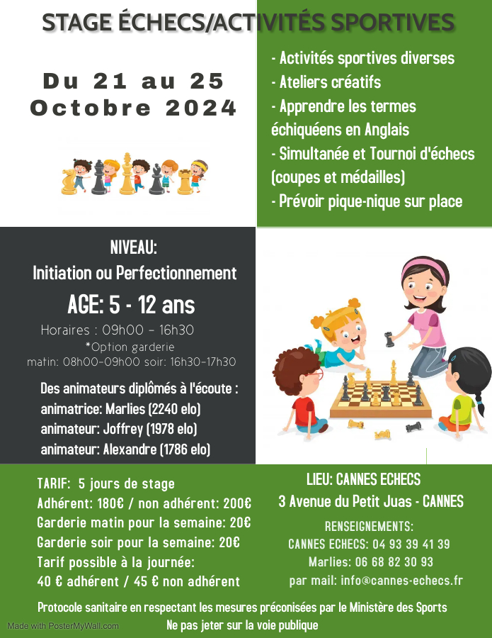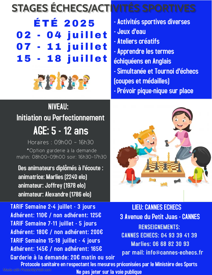Le club, situé en centre ville, rénové et inauguré en 2006, est ouvert tous* les après midis de 13 h 30 à 19 h 30 ; les samedis et dimanches sont réservés aux compétitions. (*sauf fériés et fermetures annuelles). Cannes Echecs a obtenu le label F.F.E. de club formateur, de meilleur organisateur, et de meilleur club jeune de France (5 fois Oscar ) et conquit le titre de champion de France jeunes par équipes pour la sixième année consécutive. Diverses formules modulables pour progresser, découvrir et jouer : Le club, situé en centre ville, rénové et inauguré en 2006, est ouvert tous* les après midis de 13 h 30 à 19 h 30 ; les samedis et dimanches sont réservés aux compétitions. (*sauf fériés et fermetures annuelles). Cannes Echecs a obtenu le label F.F.E. de club formateur, de meilleur organisateur, et de meilleur club jeune de France (5 fois Oscar ) et conquit le titre de champion de France jeunes par équipes pour la sixième année consécutive. Diverses formules modulables pour progresser, découvrir et jouer : Le club, situé en centre ville, rénové et inauguré en 2006, est ouvert tous* les après midis de 13 h 30 à 19 h 30 ; les samedis et dimanches sont réservés aux compétitions. (*sauf fériés et fermetures annuelles). Cannes Echecs a obtenu le label F.F.E. de club formateur, de meilleur organisateur, et de meilleur club jeune de France (5 fois Oscar ) et conquit le titre de champion de France jeunes par équipes pour la sixième année consécutive. Diverses formules modulables pour progresser, découvrir et jouer : Les cours ont lieu les mercredis et samedis, les tournois et compétitions se déroulent les weekends. Cannes Echecs est le plus important club formateur de France avec 9 titres de champion de France jeunes par équipes (record national) et plusieurs dizaines de titres individuels. L'association intervient depuis plus de 30 ans en milieu scolaire à Cannes et dans ses environs. |
